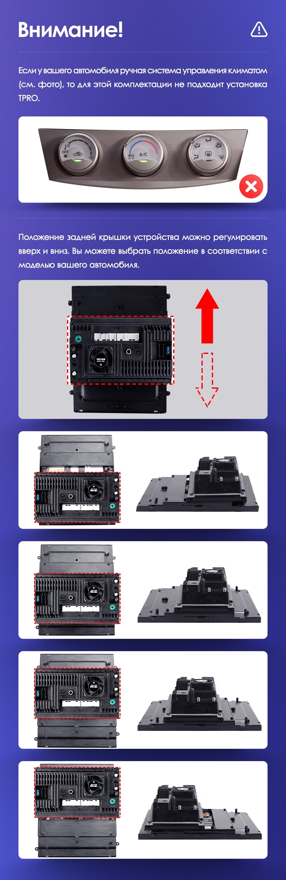 Вертикальная установка магнитолы закрывается специальной рамкой под определённый автомобиль. Утончённый, лаконичный дизайн Teyes TPRO 2 подойдёт под любую премиальную обшивку салона. Большой выбор цветовых решений интерфейса позволяет создавать индивидуальное оформление, чтобы мерцания и анимации на мониторе не отвлекали от езды. Teyes TPRO 2 - это симбиоз передовых технологий, созданный для вашего комфорта и безопасности.