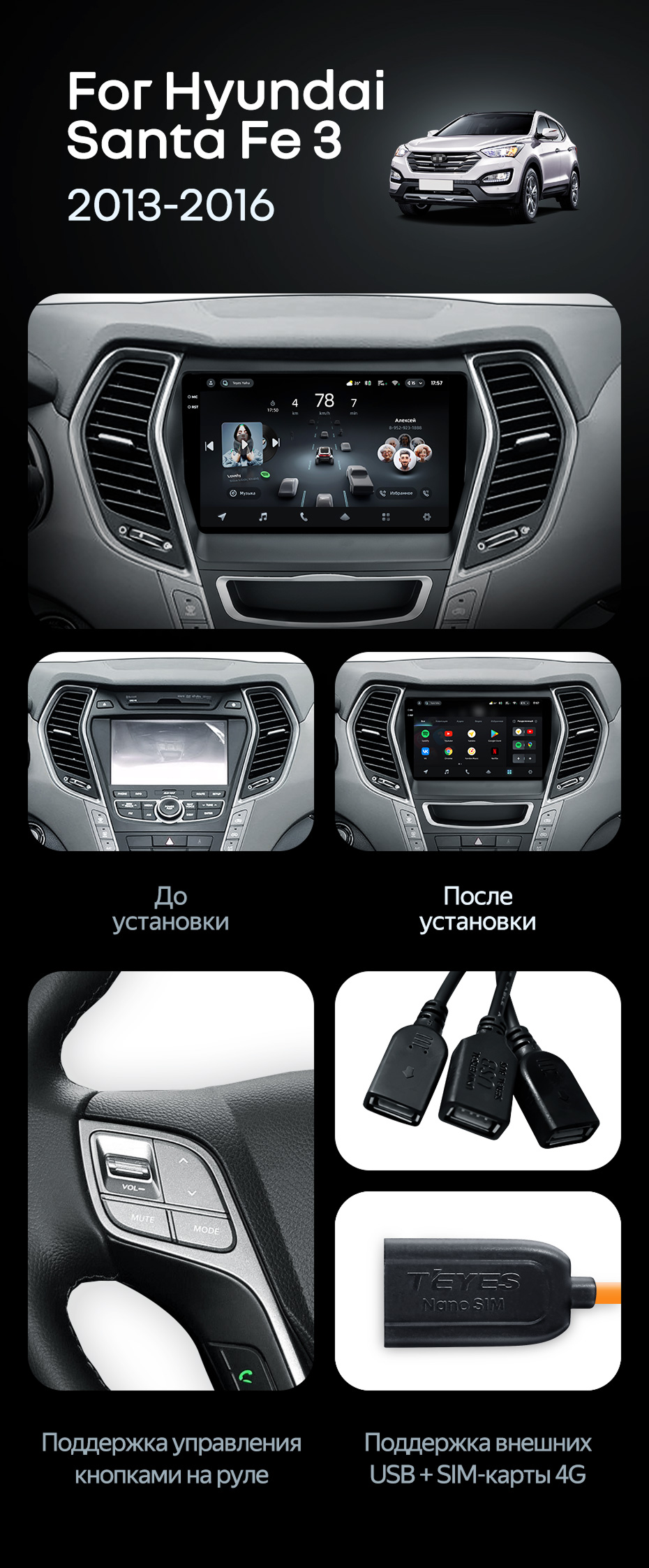 Штатная магнитола Teyes CC4 Pro 8/128 Hyundai Santa Fe 3 (2013-2016) Тип-C - купить всего за 66 220 руб. в интернет-магазине в Самаре Teyes.com.ru. ✓ Самый лучший выбор мультимедиа ✓ Лучшая замена штатному ГУ ✓ Тел. +7 (800) 775-31-74