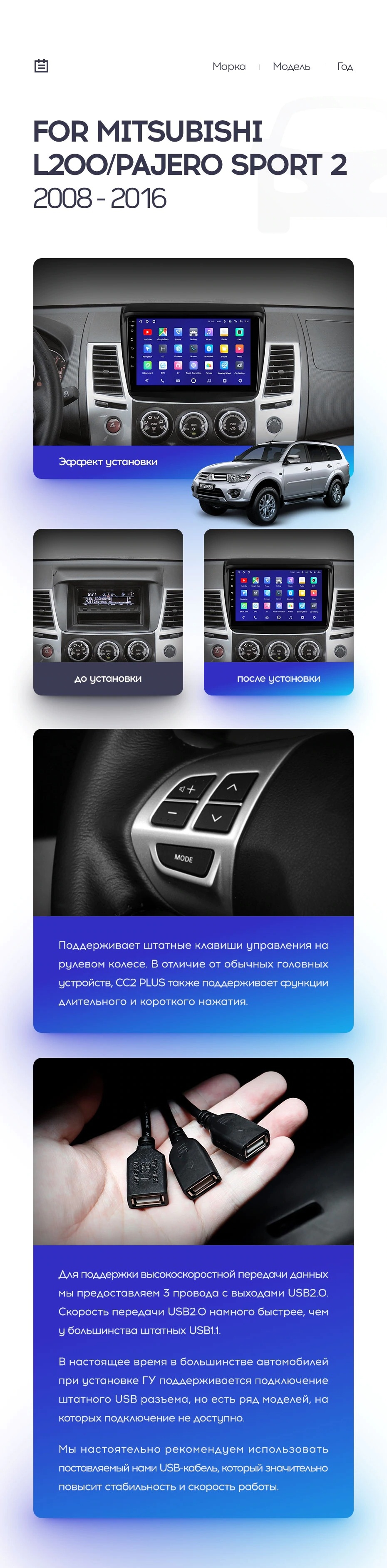 Установочный комплект для Mitsubishi L200 (2008-2016) включает переходную рамку и проводку.