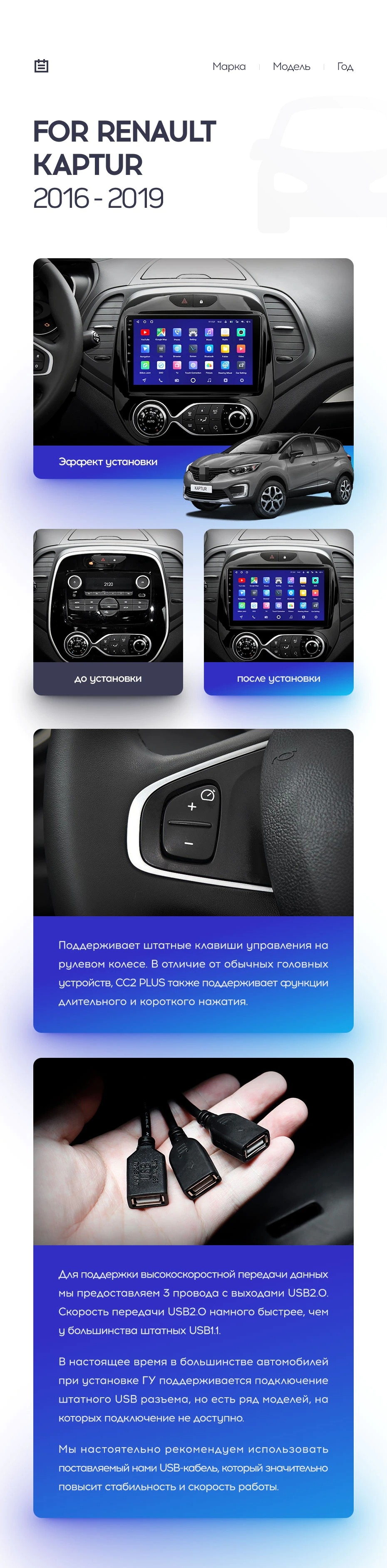 Полный комплект установки магнитолы Teyes с рамкой и проводкой можно выбрать в каталоге штатных магнитол Renault Kaptur (2016-2019).