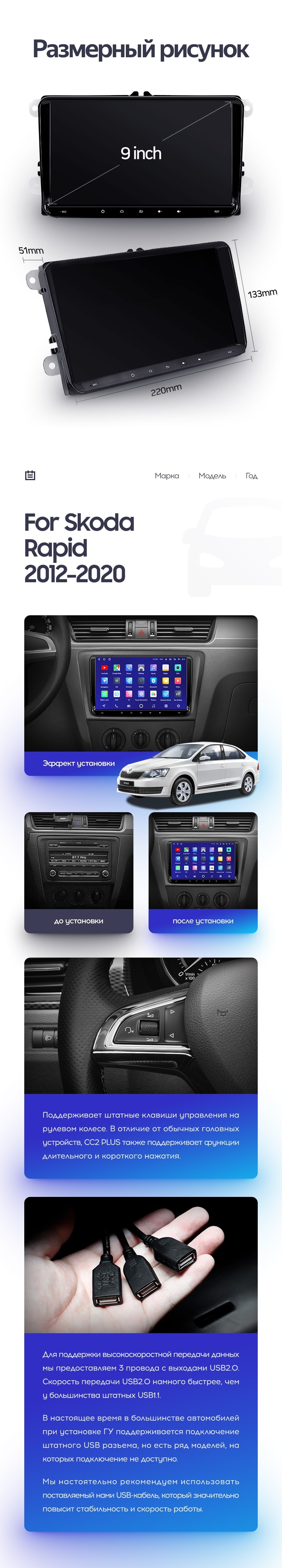 Установочный комплект для Skoda Rapid NH3 NH1 (2012-2020) включает переходную рамку и проводку.