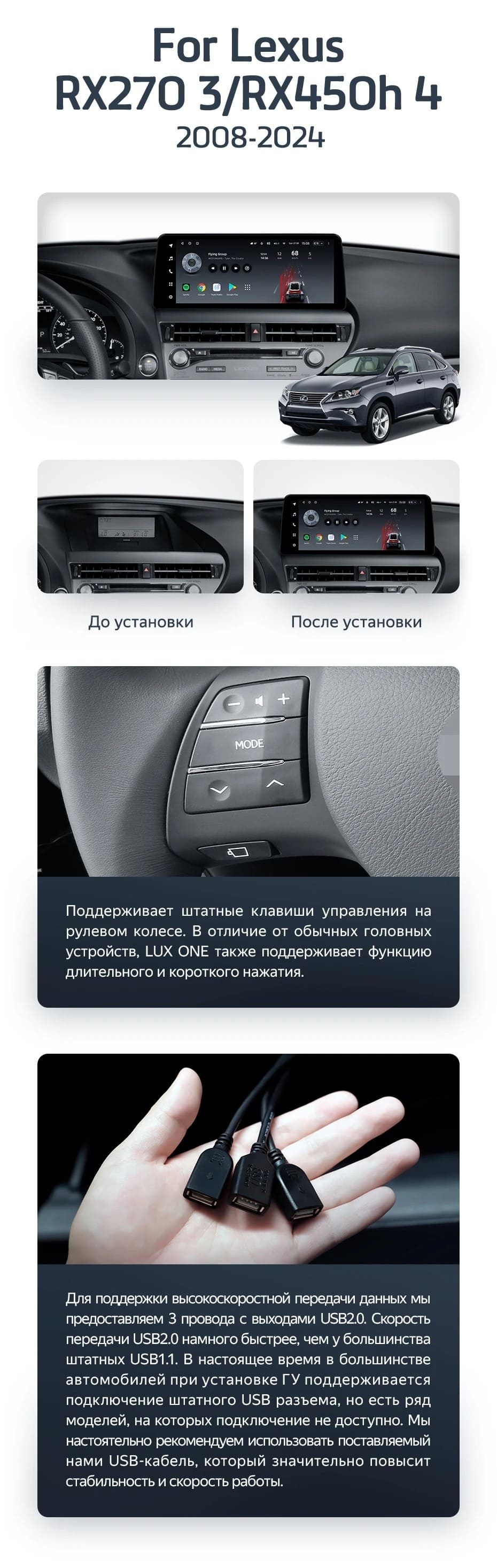 Полный комплект установки магнитолы Teyes с рамкой и проводкой можно выбрать в каталоге штатных магнитол Lexus RX270 3 RX450h 3 AL10 (2008-2015).