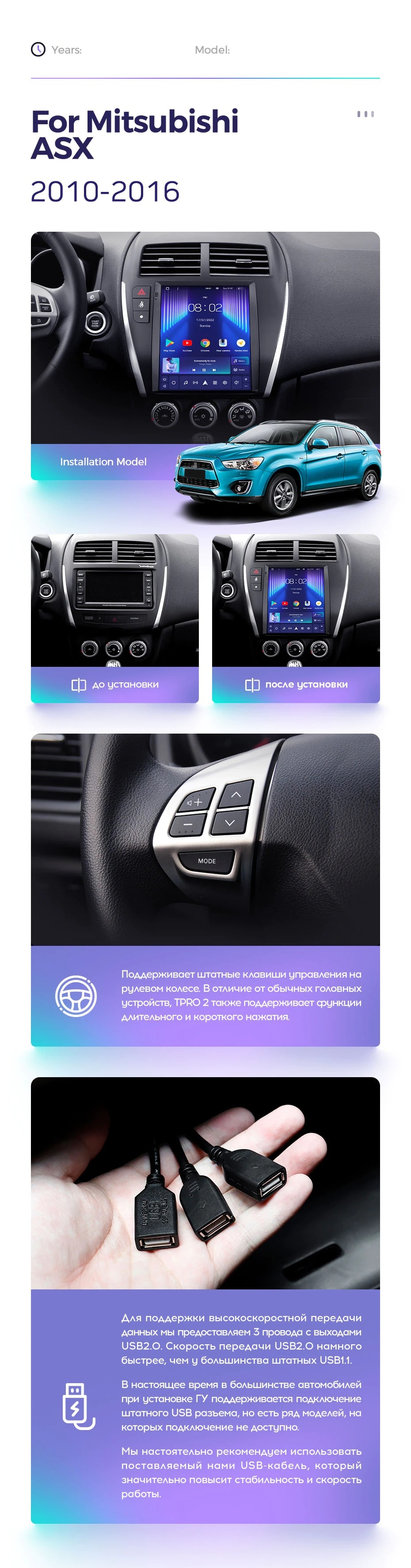 Полный комплект установки магнитолы Teyes с рамкой и проводкой можно выбрать в каталоге штатных магнитол Mitsubishi ASX 1 2010-2016.